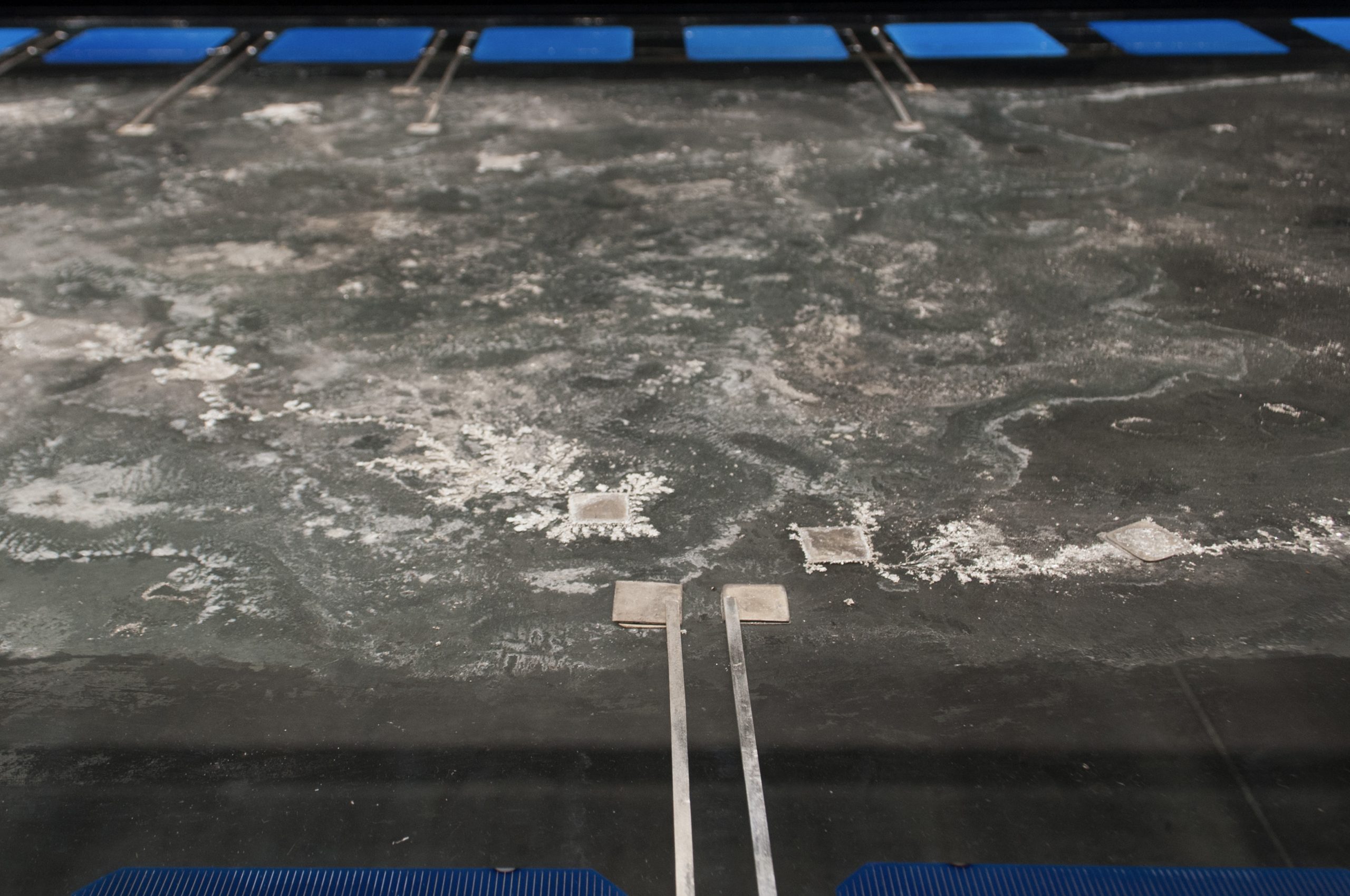 Memento : rappelons-nous en effet que Nicéphore Niépce, le pionnier, appela son invention « héliographie », littéralement, l’écriture du soleil. 200 ans plus tard, Hugo (permettez que je l’appelle Hugo), perpétue à sa manière cette écriture directe, puisque la lumière qui éclaire et active donc l’électrochimie présente sur la table provient non pas d’EDF mais d’un panneau solaire fixé sur le toit du Fresnoy. Le titre de son installation, “Électrographie de l’argent”, fait donc référence directement à l’histoire de la photographie, puisque c’est Niépce qui tenta le premier de l’utiliser pour faire une image, en plaçant du sel d’argent au fond d’une chambre noire. Mais ça n’a pas été concluant. Ensuite, c’est le daguerréotype qui se composait d’une plaque de cuivre recouverte d’une couche d’argent, exposée à des vapeurs d’iode, qui se combinaient à l’argent par réaction chimique, pour créer de l’iodure d’argent, sensible à la lumière. Ensuite, ceux que les Anglais considèrent comme le véritable promoteur de la photographie (et mon gène anglais qui remonte à une quadrisaïeule britannique du côté paternel m’en trouve d’accord), c’est William Fox Talbot qui invente le négatif. Contrairement à l’image positive du daguerréotype, sa technique permet de reproduire plusieurs fois l’image sur du papier. De 1839 à 1841, Fox Talbot travaille sur son procédé (le calotype) pour l’améliorer. L’exposition en chambre noire est maintenant réduite, grâce à un traitement à l’acide gallique qui permettait un développement de l’image latente. L’hyposulfite de soude (découvert par le scientifique John Herschel) lui permet de fixer l’image. Le fixateur dissous les sels d’argent et donne une pérennité à l’image.
