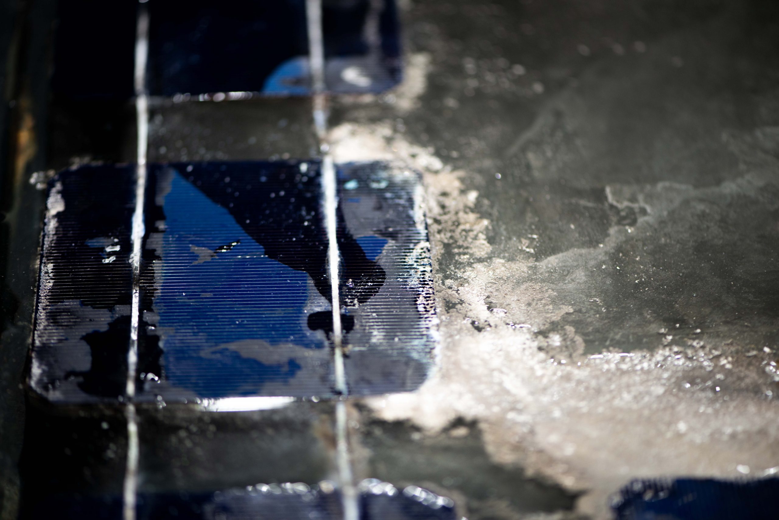 Nous pourrions très bien voir là une carte du Point de situation, au moment T, comme on dit dans le langage stratégique. De plus près encore, l’image montre des plaques photovoltaïques encore parées d’un beau bleu azur qui paraît bien calme en regard du combat central.
