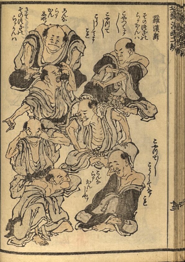 Vous voyez le genre ? Le manga existait bien avant l’existence même de Yoshitomo Nara, et, ce qui est très intéressant, c’est que si, pour la plupart des gens, en Europe disons, le manga est l’équivalent de la BD, il faut préciser que l’étymologie a décidé une fois pour toute du style, qui, dans l’ensemble, s’est conformé à son origine, à savoir la caricature. C’est à Hokusai, excusez du peu, que nous devons l’invention du mot. Il lui fallait trouver un terme pour ces dessins jetés dans ses carnets de croquis. Il associe alors les mots man et ga ; ce qui donne comme définition : « dessins foisonnants », « images dérisoires » ou encore « dessins grotesques ». Ceci dit, quand on regarde un peu les dessins jetés par Hokusai dans ses carnets, il y aurait sûrement encore de quoi rendre jaloux un bon nombre d’artistes :