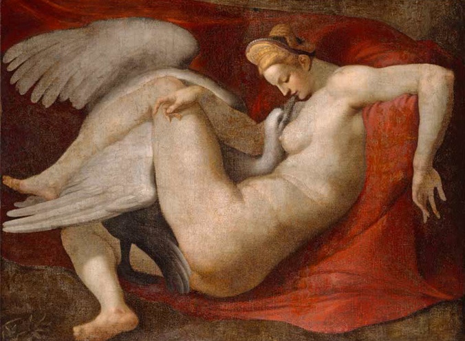 Zeus arrive “en cygne”. Et soudain, parvenu à sa hauteur, voilà qu’il saute sur Némésis, et la viole ! C’est ce qui s’appelle, littéralement, “violer dans les plumes” ! Zeus est vraiment un sale Dieu. Il a violé Europe, déguisé en taureau, Némésis-Léda, et combien d’autres ? Cependant, il est assez remarquable de noter, semble-t-il, que toutes les représentations artistiques, depuis l’Antiquité jusqu’à Gustave Moreau, par exemple, donnent une image du viol pour le moins consensuel. Prenez par exemple cette copie exécutée au XVIe d’un tableau (perdu) de Michelangelo Buonarroti :